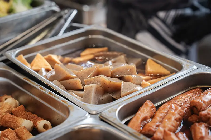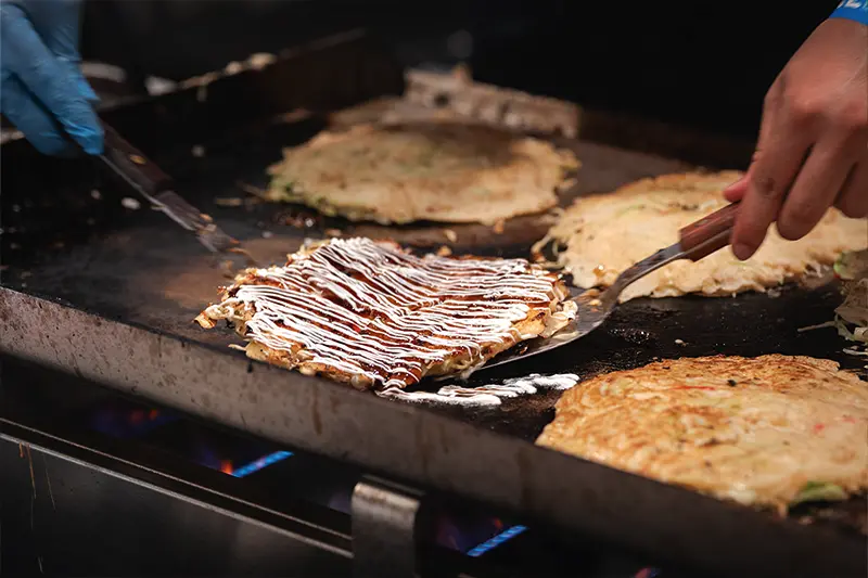 A variety of Japanese food stalls offering everything from savory dishes to sweet desserts.